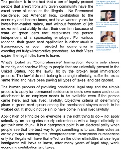An alternative approach can be to survey businesses to establish the number of workers that will need to be imported in each profession – IT, Finance, and so on. Based on these numbers, allocate Visa and Green Card numbers to be given out that year. In granting Visas, go in decreasing order of wage offered to the immigrant worker. In granting Permanent Residence, go in decreasing order of the tax the person paid in preceding 5 years. This approach automatically favors the professionals that are the best contributors into the economy (as producers and consumers) and the welfare system, and truly most needed by employers because the wage paid says more than anything else on this matter; while, with the numerical caps, also prevents the displacement of “US workers” by wage undercutting. No file-by-file procedure Bureaucracy or employer sponsorship or expensive attorney representation required to run this - this can work more like applying to DMV for a driver's license with a few required documents or merely the SSN. This approach also incidentally increases the concentration of such people in society that will be able to stomach a complete breakdown, or partial or complete rollback, of the welfare system should it occur.